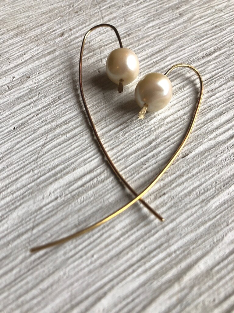 Baroque Pearl drop brass slider earrings on brass wire. Wire slides through the ear and hangs from the back about 3 inches.